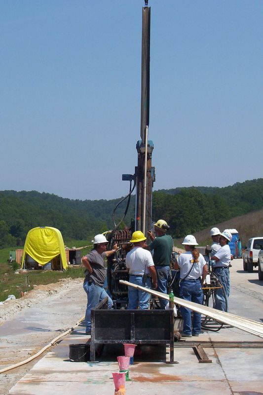The work included: sonic overburden drilling and casing installation through the earthen section of the dam, percussion rock drilling, exploratory core drilling, borehole washing, borehole video imaging, permeability testing, pressure grouting using balanced stable grout mixes and low mobility grouting for treatment of the solution rock features. Grouting materials included: portland cement, bentonite, superplasticizer, welan gum, and low mobility grout.