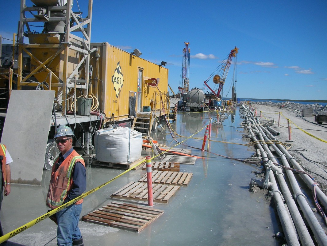 The project site is located in the Northwest Territories in Canada and is situated in the Arctic Circle, approximately 230 KM (140 Miles) North of Yellowknife. The project was subjected to severe winter conditions with temperatures as low as –50° C (-58° F). Operating in these severe winter conditions required a custom water heating/distribution plant, a custom built automated grout batch plant, and custom built mobile grout header stations.