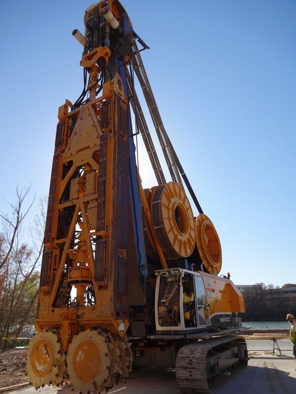 592 lineal feet (180 meters) of the wall was constructed to a depth of 29 feet (8.8 meters), while 141 lineal feet (43 m) of the wall was constructed to a depth of 62 feet (19 m). Reinforced concrete guide walls were installed to facilitate initial alignment for the cutter equipment. Onboard computer control enabled the wall to be maintained within alignment tolerances to the final depth.